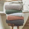 Minimalista e atemporal, as Toalhas Line são construídas em jacquard com felpa de fio retorcido e com seu corpo canelado.